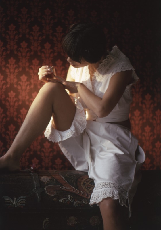 Bilden föreställer en kvinna fotograferad i trekvartsfigur, sittande inomhus på en kista framför en vägg med röd och svart medaljong tapet. Kvinnan är klädd i ett linne och knälånga byxor, allt underkläder i vitt. Linnet har brodyr vid hals och ärmar och byxorna på bensluten.
