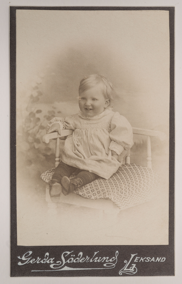 Visitkortsporträtt av Hilma Thorells och Landsfiskal Thorells barn, Åke Thorell. Fotografiet sitter i fotoalbum som tillhört Gertrud Zachau. Fotografiet sitter på sida 27.