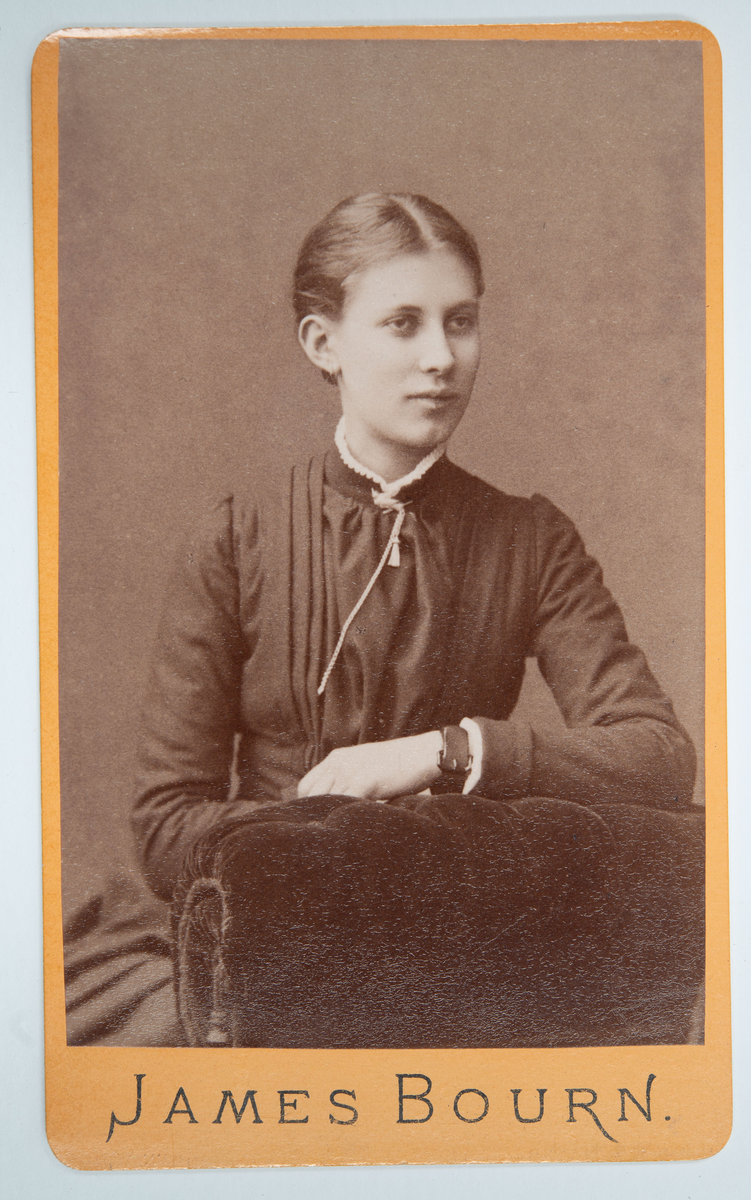 Visitkortsporträtt av okänd kvinna.Fotografiet sitter i fotoalbum som tillhört Gertrud Zachau. Fotografiet sitter på sida 13.