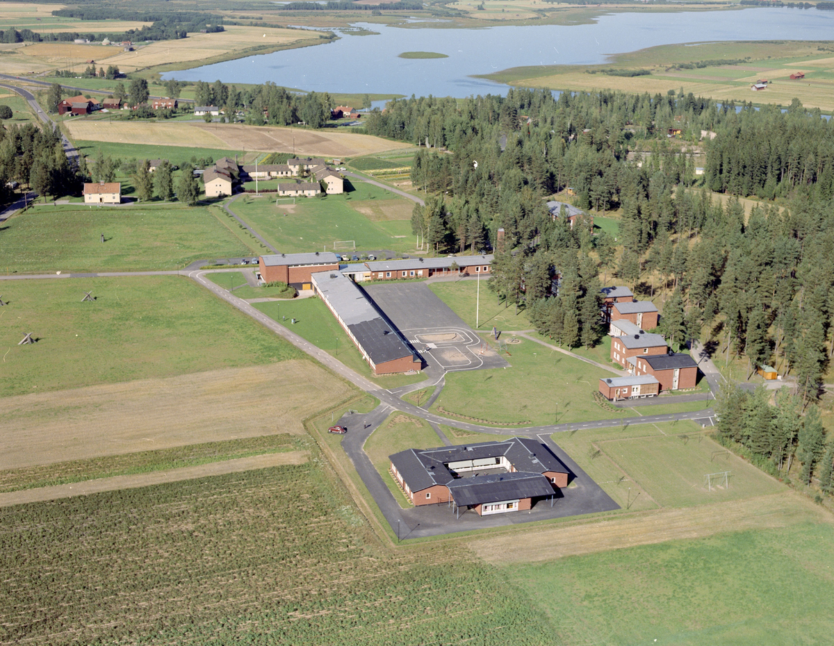 Titel: Flygfoto över Hedemora, Backa skola i förgrunden, sjön Hovran.