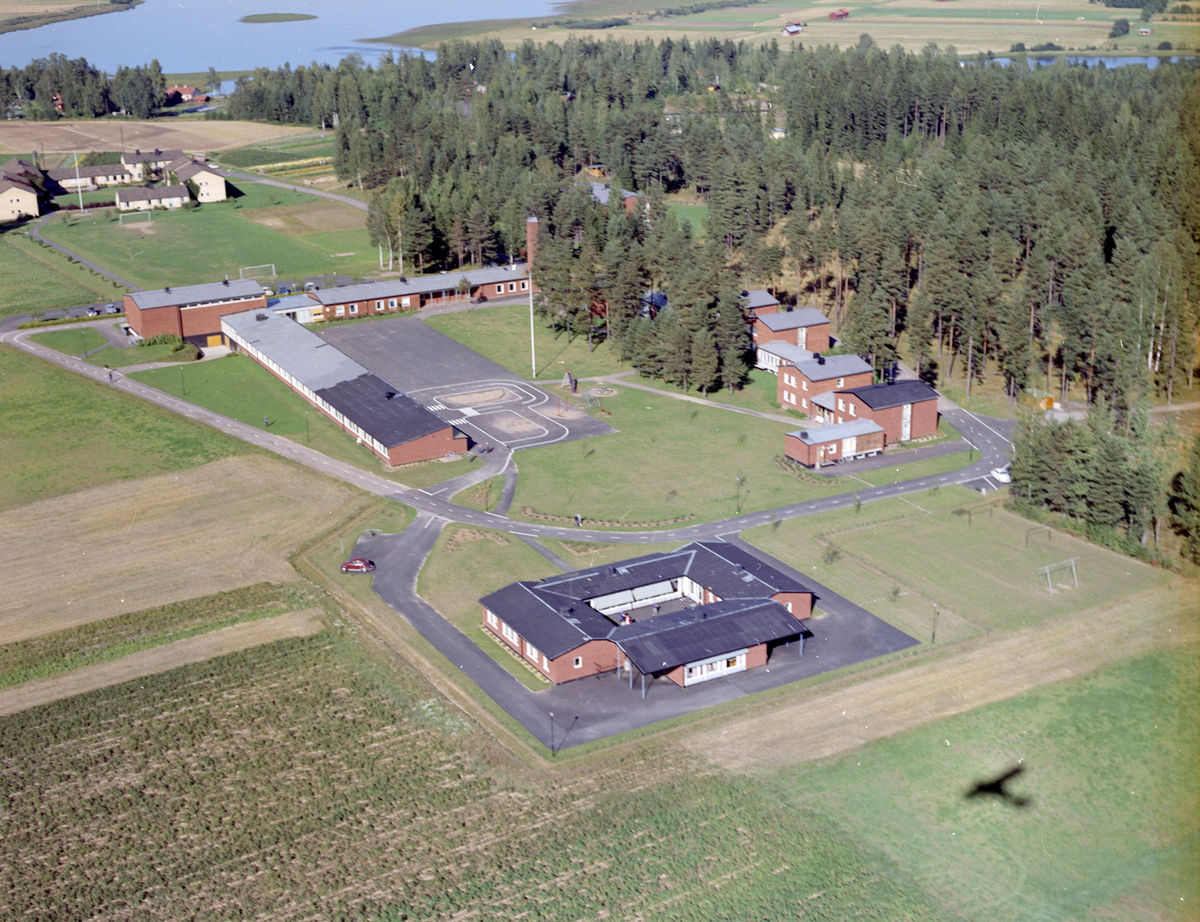 Flygfoto över Hedemora, Backa skola i förgrunden, sjön Hovran.