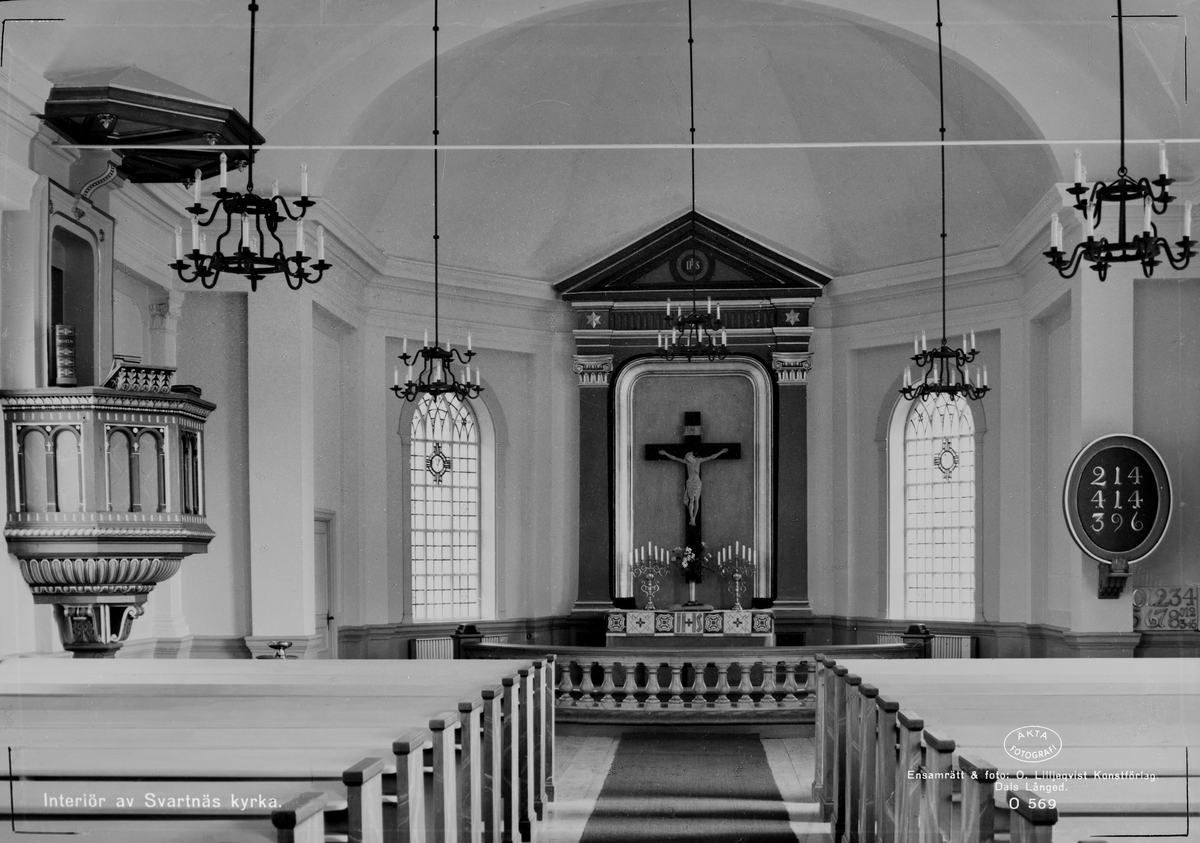 Interiör av Svartnäs kyrka. Läs mer om Svartnäs kyrka i boken: Dalarnas kyrkor i ord och bild.