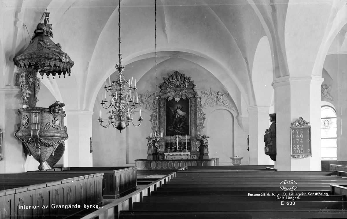 Interiör av Grangärde kyrka. Läs mer om Grangärde kyrka i boken: Dalarnas kyrkor i ord och bild.