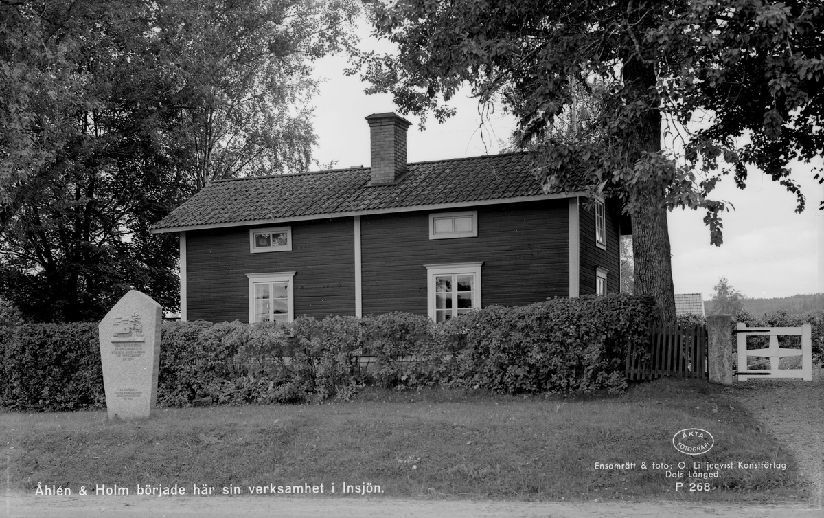 Åhlén & Holm började här sin verksamhet i Insjön. Minnesten med text: Här i denna stuga på Brittasbacken började Åhlén & Holm sin verksamhet år 1899.