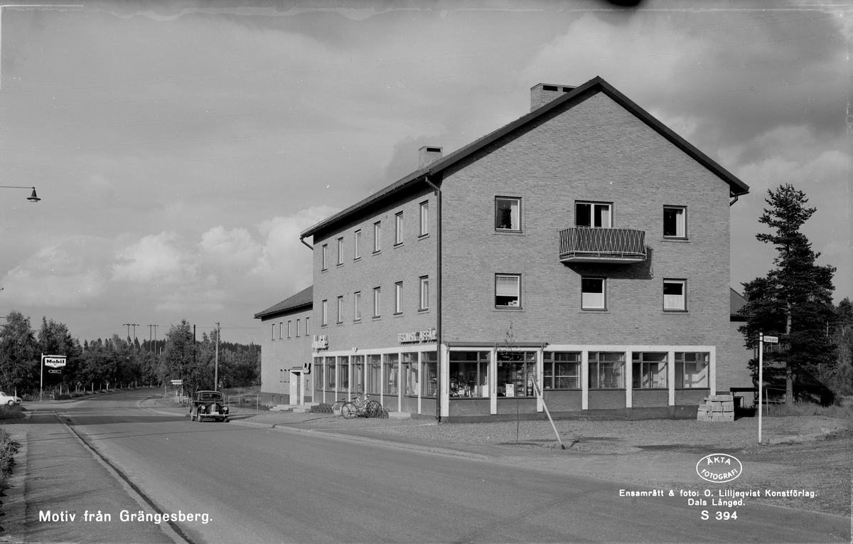 Motiv från Grängesberg. Skyltar med text: Mobil; Köpmangatan.