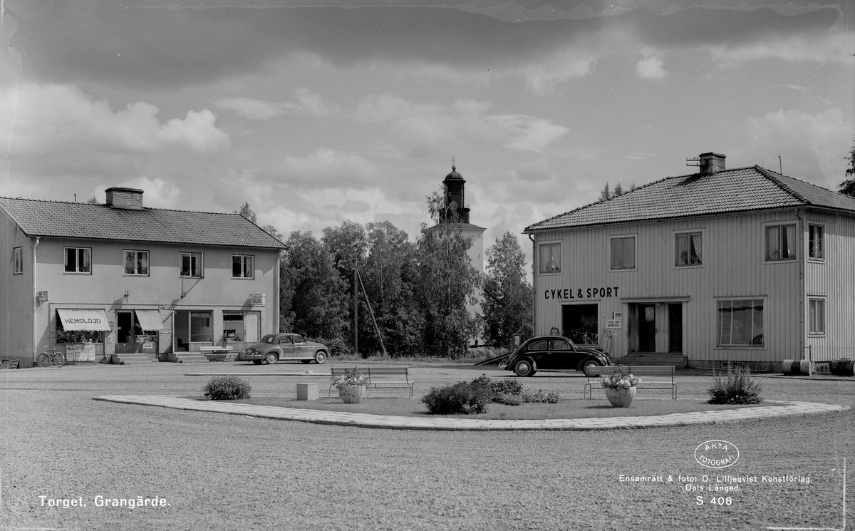 Torget, Grangärde. Skyltar med text: Hemslöjd; Cykel & Sport; Telegraf Telefon; Herr & dam frisering; Cykel rep. verkstad.