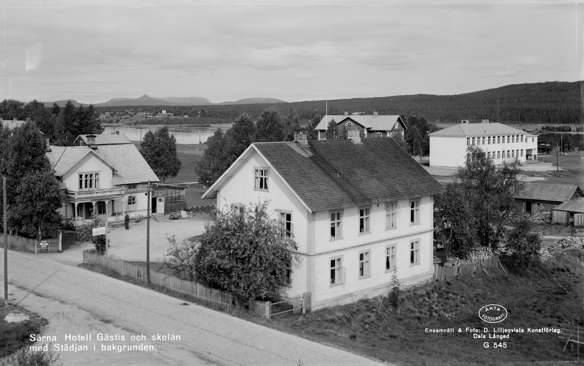 Hotell Gästis och skolan med Städjan i bakgrunden, Särna, Älvdalen.