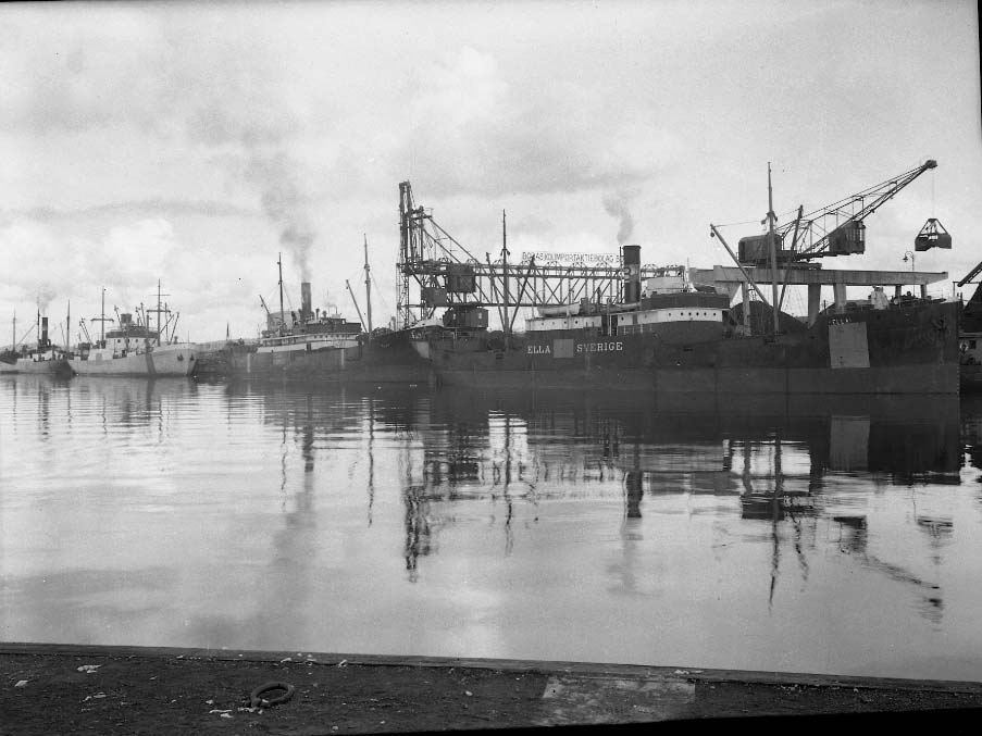 Lastbåtar vid Borås Kolimport AB:s kaj i Varbergs hamn. Fartyget till höger är svenskt och heter Ella. 1904 anlades denna 200 meter långa stenkaj norrut i Varbergs hamn, med kolgård och cisterner för lysolja. Borås Kolimport satte år 1912 upp en rälskran mellan kaj, järnvägspår och kolgård.