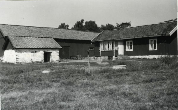 Rörmöst gård i Vallda med bostadshus, ladugård och en liten murad stenbyggnad.
