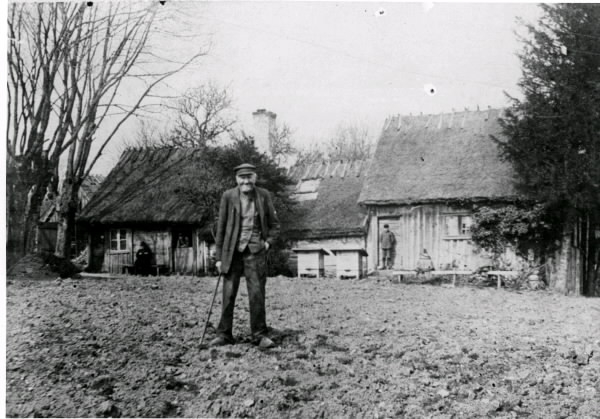 Uppgifter om bilden från följebrev när bilden lämnades in till museet: "Sänder här en bild på ryggåsstugan i Hörsås, som senare flyttades till Galgberget i Halmstad. Mannen i förgrunden är August Larsson som bodde i sin stuga till sin död. Hans maka Severina Larsson avled tidigare. Tyvärr minns jag ej vilka årtal men det går väl att få uppgift på hos pastorsämbetet i Getinge, om bilden har något värde för ett kommande bokverk. Mannen till vänster på bilden sittande, är Nils Carlsson som köpte gården av August Larsson och sedermera sålde ryggåsstugan till Halmstad. Severina och August Larsson levde på undantag från gården som det hette. I dörröppningen står Karl och på bänken mellan bikuporna Oskar Nilsson, båda söner till Nils Carlsson. De äger och brukar gården Hörsås efter sin fader".
