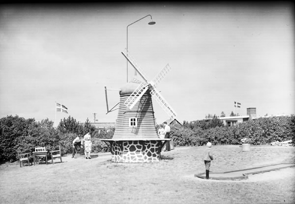 Skummeslövsstrand. Åstrands minigolfbana. Människor som spelar minigolf. Väderkvarn, svenska flaggan, trädgårdsmöbler.