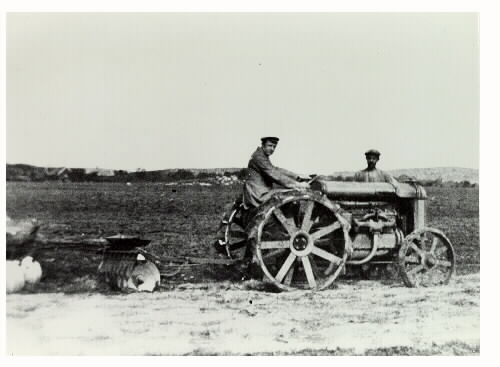 Lindhofs kungsgårds första traktor, inköpt 1924. En man sitter på traktorn och en annan står bakom ekipaget.