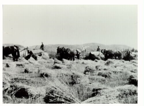 Skördearbete. Fyra stycken självbindare dragna av hästar på rad vid veteskörden på Lindhofs kungsgård. I förgrunden ligger de bundna vetenekarna. Fotografi från slutet av 1920-talet.