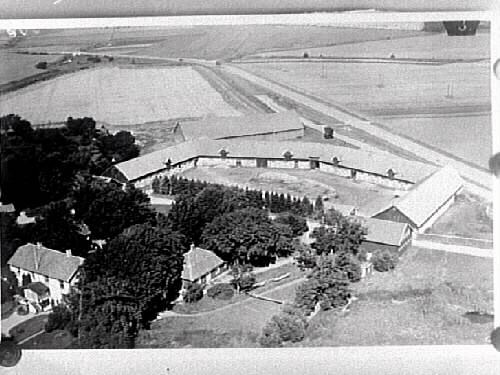 Lindhovs kungsgård sedd från ovan med mangårdsbyggnaden nere till vänster och de sammanbyggda ekonomibyggnaderna i u-form till höger vid vägen. Se även bildnr MR2_2639.
