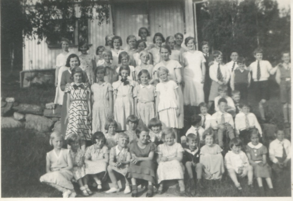Greta Hernqvist (1895 - 1984) med söndagsskolebarn i olika åldrar utanför Missionshuset (Kållereds missionskyrka), okänt årtal.