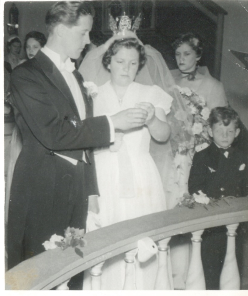 Bröllop i Bollebygd kyrka år 1956 mellan Lennart Johansson (1926 - 2014), Heljered Mellangård, och Eivor Johansson (1931 - 2001). Eivor arbetade i många år som församlingspedagog inom Svenska kyrkan i Kållered.