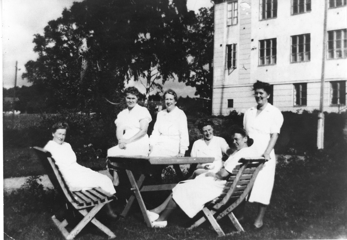 Personal från "Tvätten" sitter och fikar utomhus, "Asylen" vid Stretereds skolhem, cirka 1940. Från vänster: 1. Mia Andersson. 2. Klara Axelsson. 3. Betty Johansson. 4. Asta Jönsson. 5. Annie Borg. 6. Lilly Franzén, Tulebo. Asylen byggdes 1917 - 1918 och låg i backen mot Tulebosjön. Revs på 1970-talet. I källaren låg tvätten.