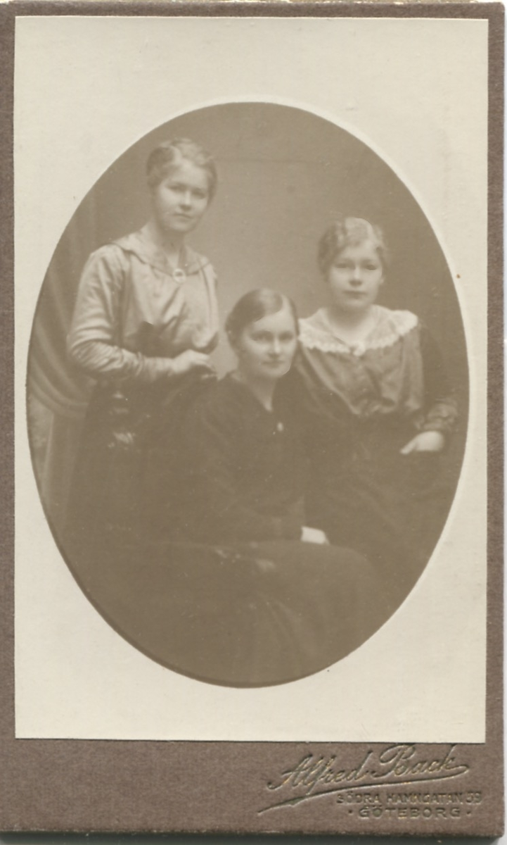 Ateljéporträtt av systrarna Anna Johansson (1892 - 1966, gift Vessberg), Hilda "Hildur" Johansson (1898 - 1985) och Svea Johansson (1892 - 1976).