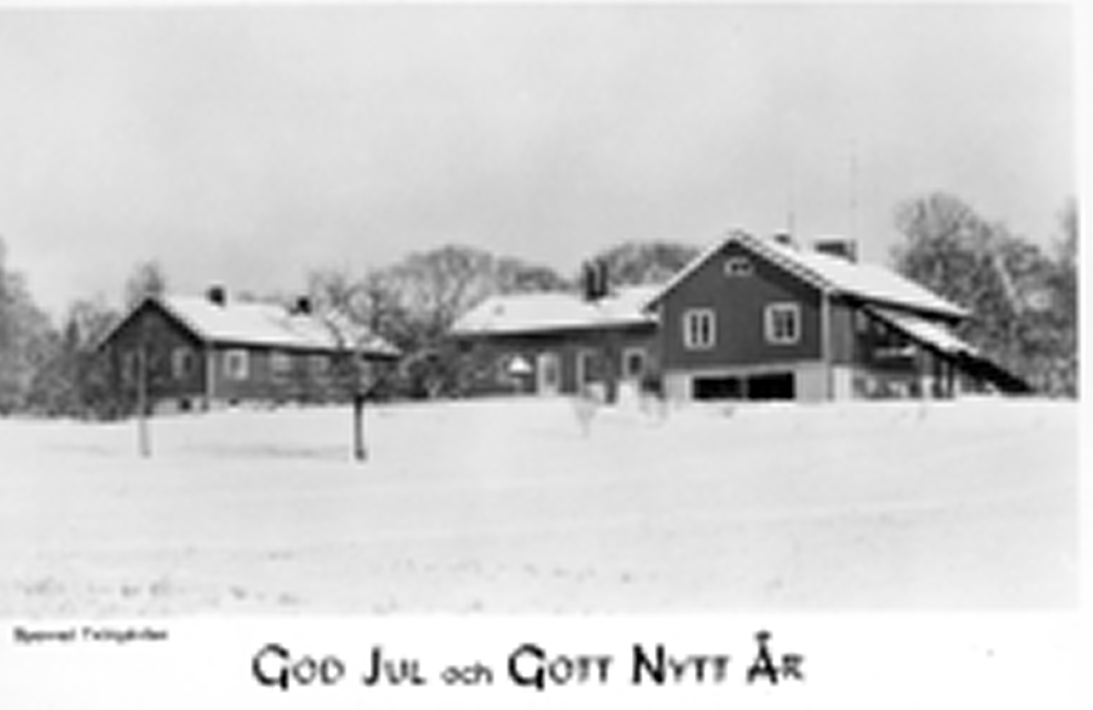 Dubbelvikt julkort, med Sporred Tvärgården på ena sidan och dess trädgård på den andra, med den tryckta texten "God Jul och Gott Nytt År önska Wanja och Torsten Söderberg." Okänt årtal.