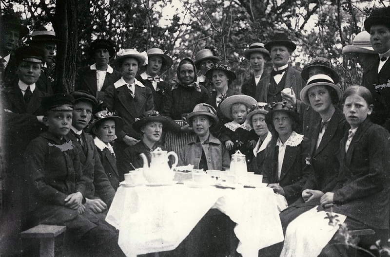 Delar ur Kållereds Missionsförening cirka 1914. På utflykt, möjligen till skärgården eller Billdal.