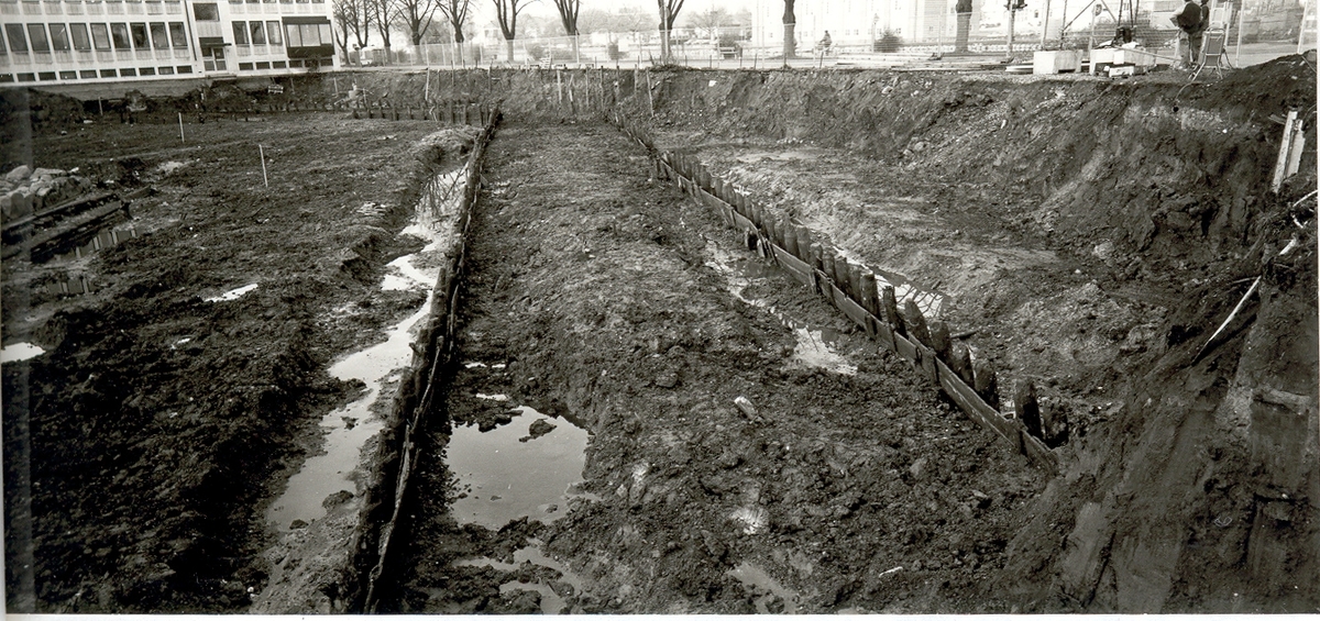 Arkeologisk utgrävning inför byggandet av nya landstingshuset. Pålverket sett från öster.