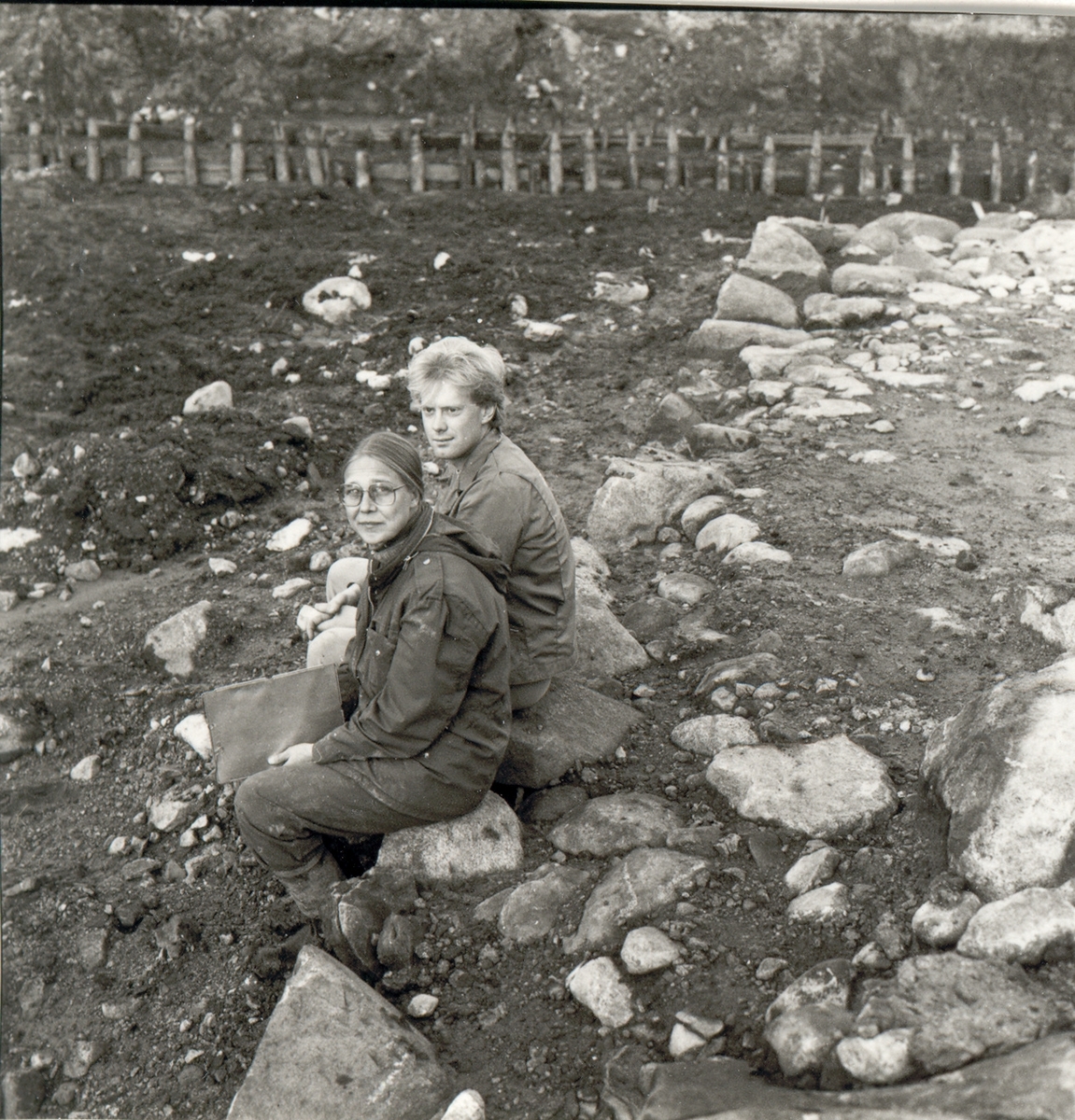 Arkeologisk utgrävning inför byggandet av nya landstingshuset. Grävningsledaren Eeva Rajala och grovarbetaren Thomas Karlsson sittande på en av bastionsmurarna.