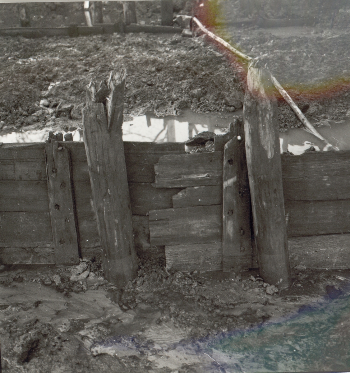 Arkeologisk utgrävning inför byggandet av nya landstingshuset. Två brädsektioner möts.
