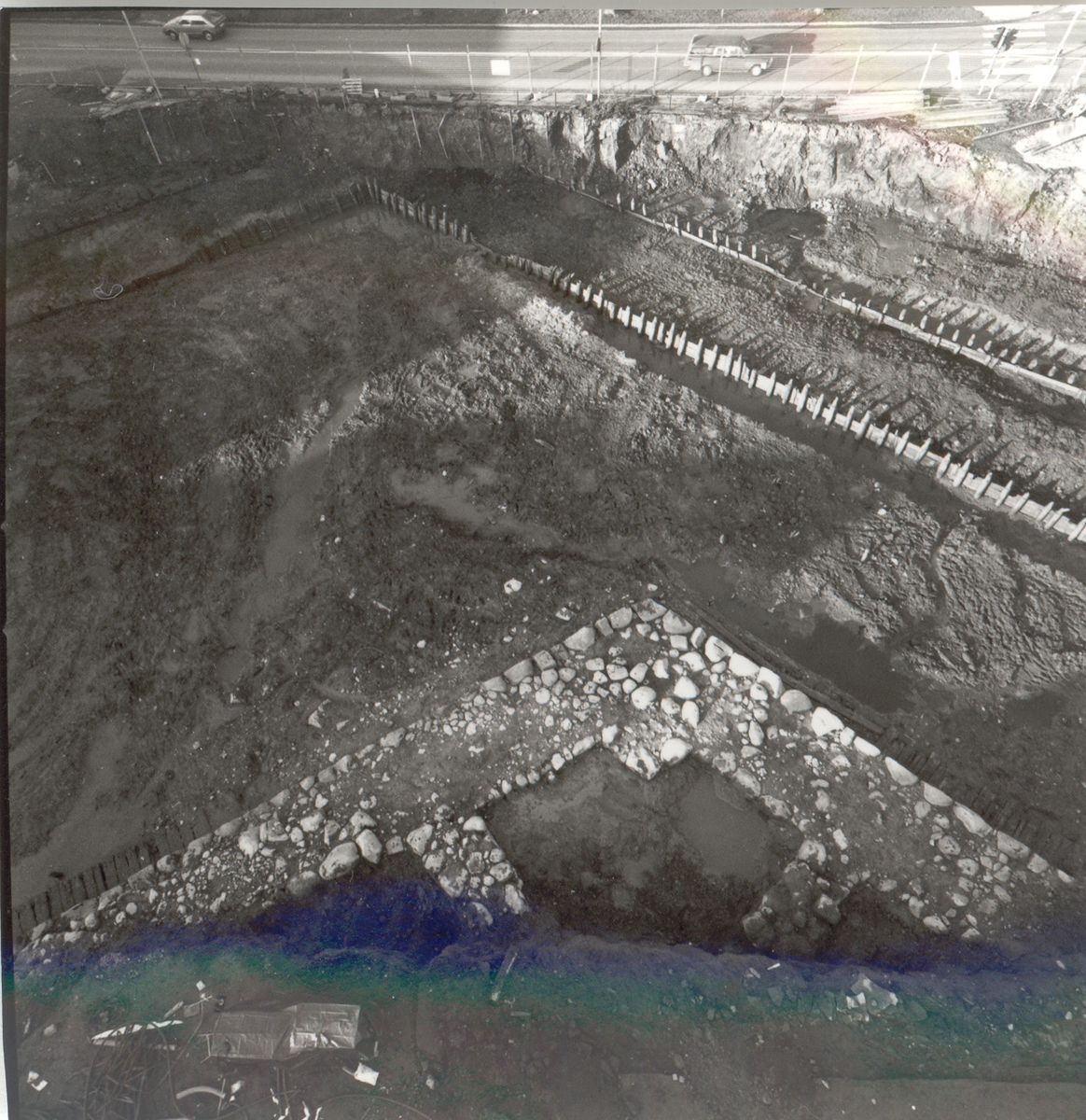 Arkeologisk utgrävning inför byggandet av nya landstingshuset. Bastionen och en del av pålverket, sett från ovan.