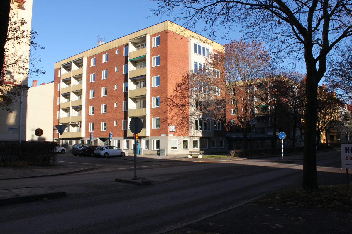 Brf Adelsklubben sedd från väster och Staketgatan.