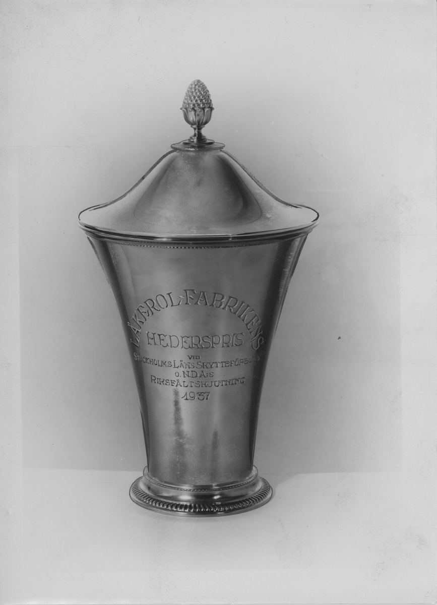 Gravyr på pokalen lyder: "Läkerolfabrikens hederspris vid Stockholmsläns skytteförbund o NDA:s Riksfältskjutning 1957."