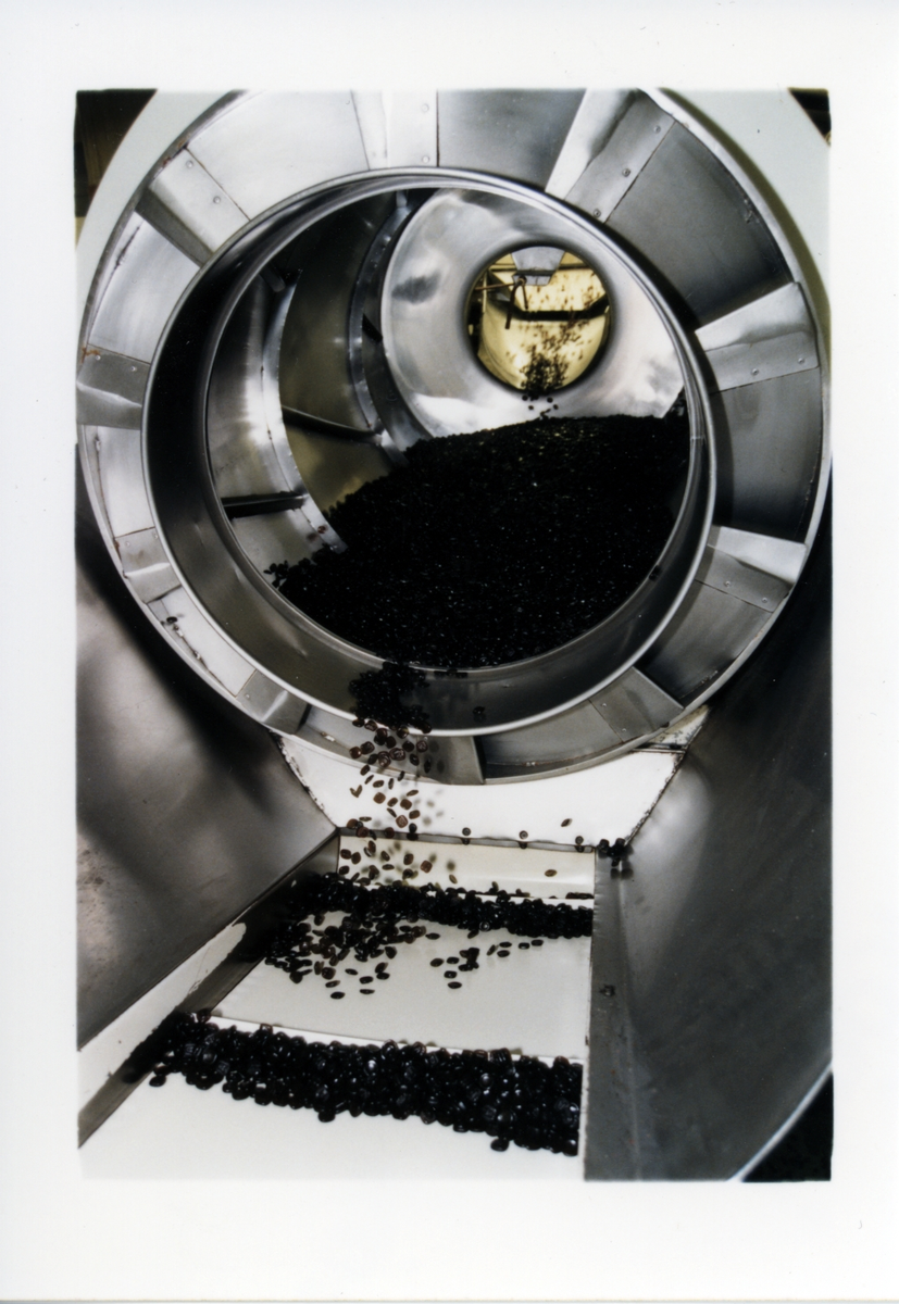 Glansning av tabletter. Läkerol i metalltrumma innan de far ut och vidare på vitt transportband.