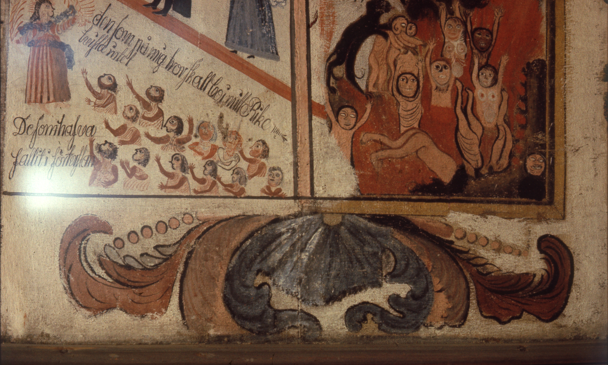 Del av väggdekor med bibliskt motiv. Jesus predikar och skärselden.