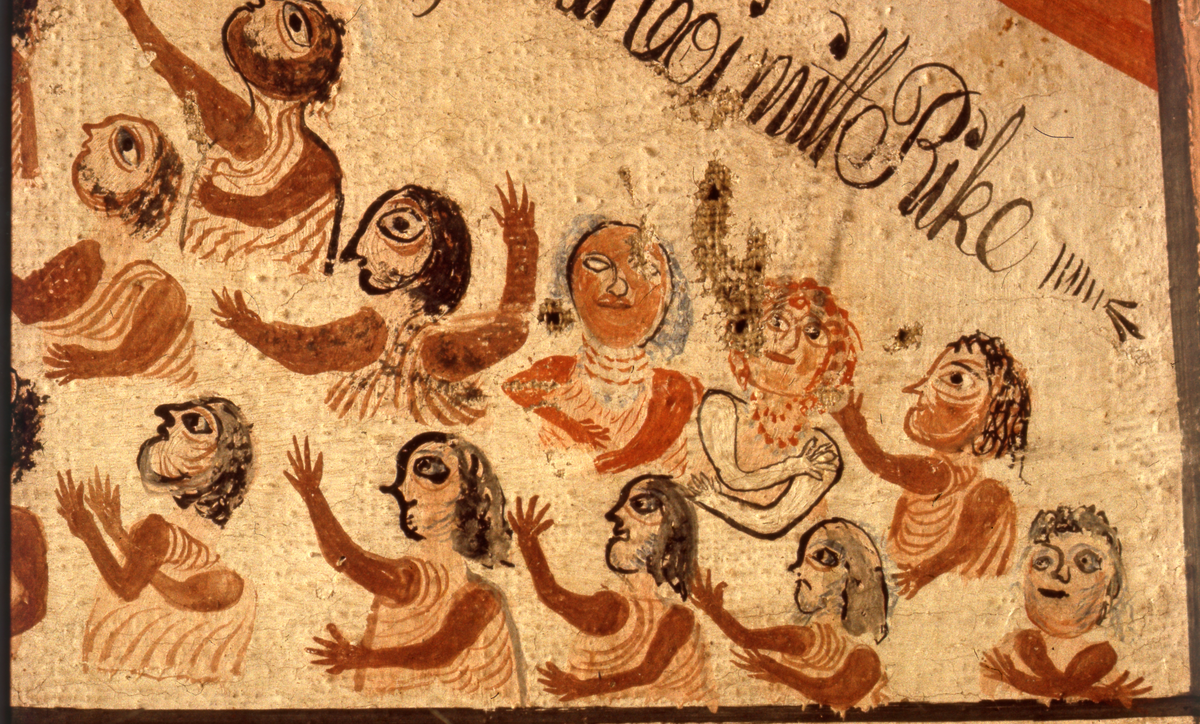 Del av väggdekor. Bibliskt motiv. Detaljbild på en samling människor.