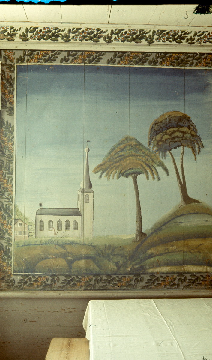 Del av väggmålning, natur, träd. Kyrka i bakgrunden.