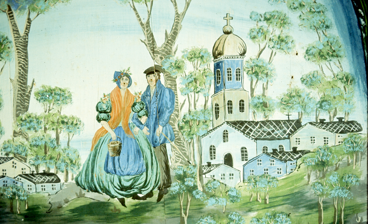 Del av väggmålning. Ett par, natur och bebyggelse.