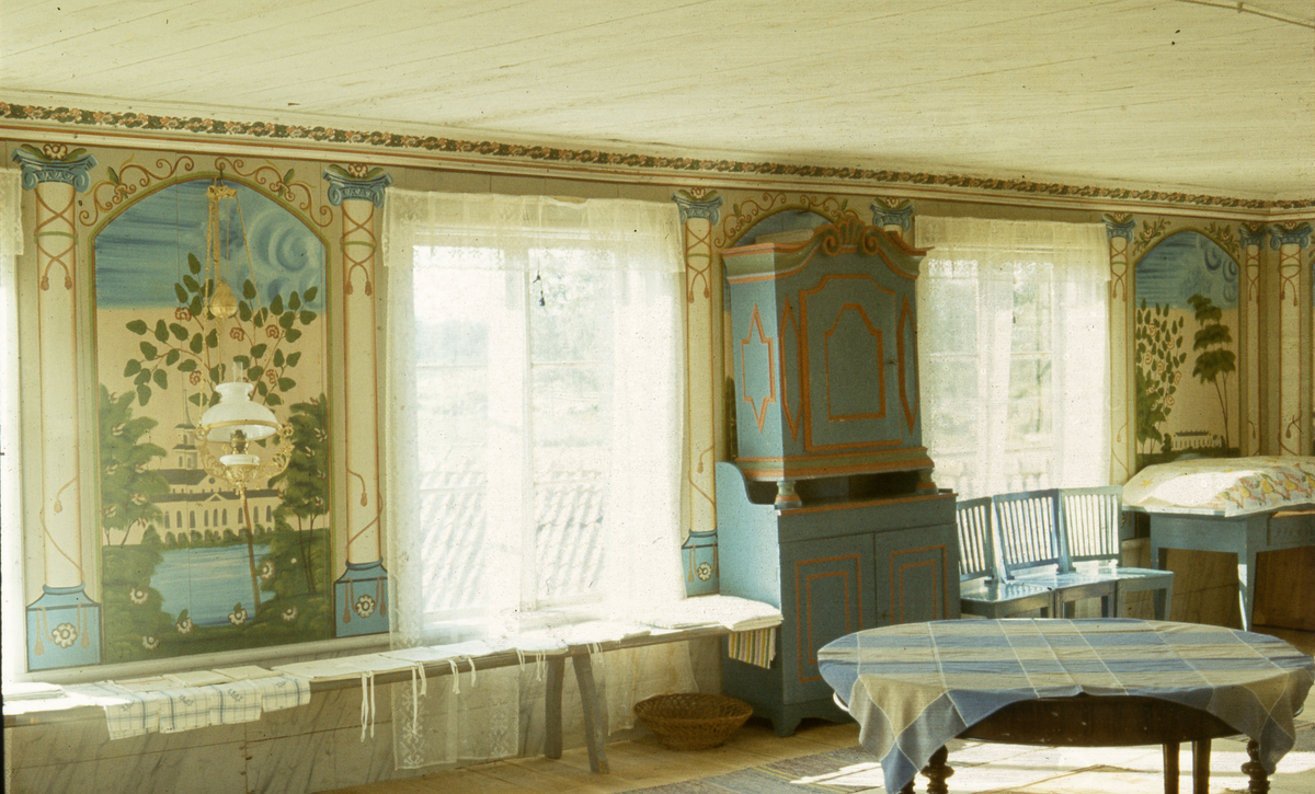 Rumsinteriör, storstuga, på gården Pallars. Väggmålningar, dekormålad taklist och möbler.