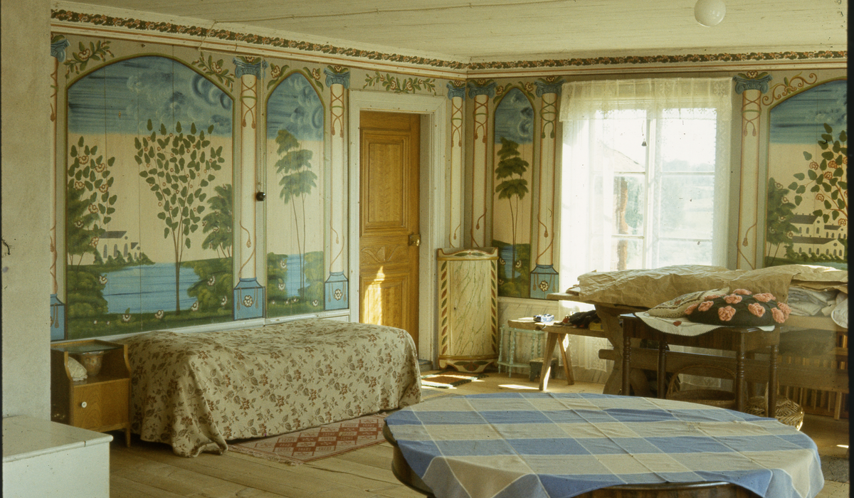 Rumsinteriör, storstuga, på gården Pallars. Väggmålningar, dekormålad taklist och möbler.