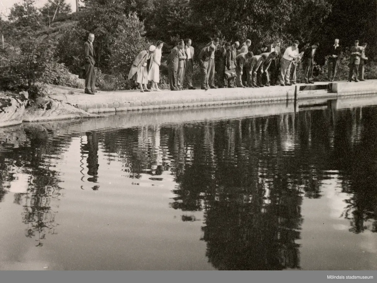 Ett antal kvinnor och män står samlade vid sjön Södra Långvattnet i Mölndal, okänt årtal.