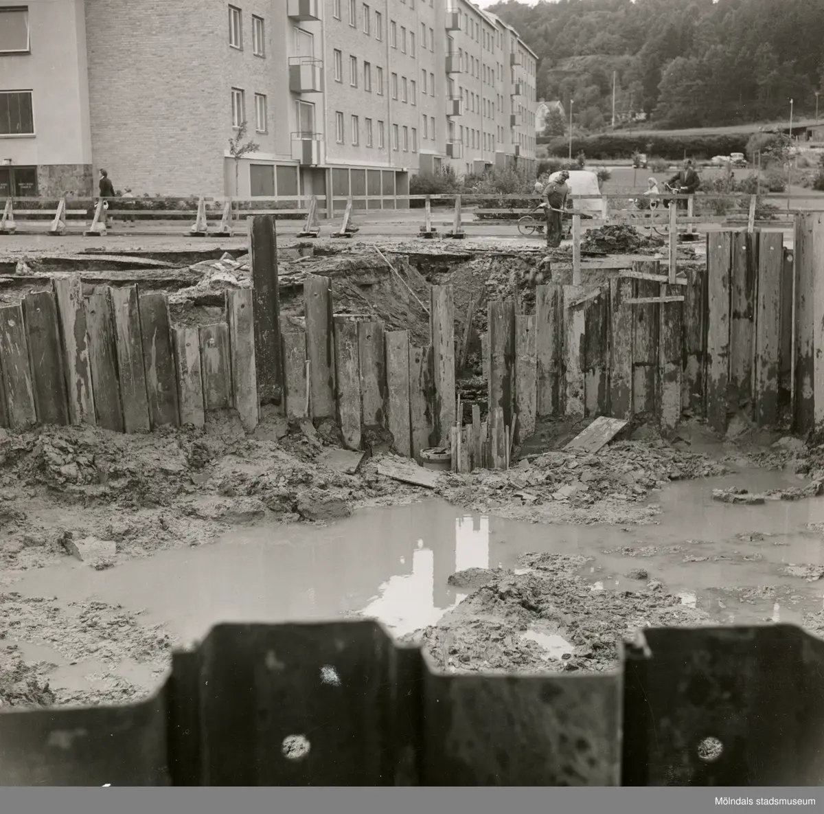 Från byggnationen av Cityköp vid Biskopsbogatan i Bosgården, Mölndal, hösten 1957.