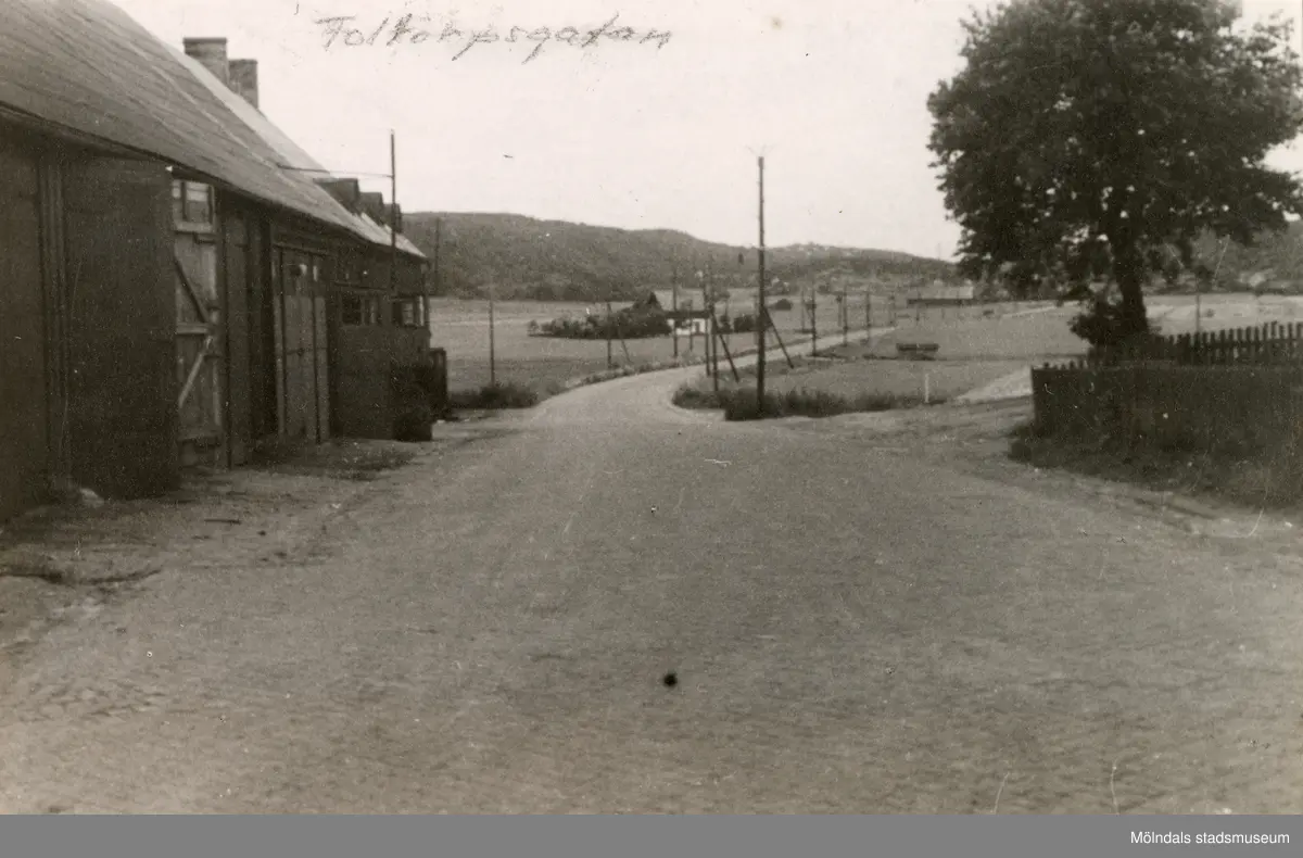 Åby i Mölndal, okänt årtal. Toltorpsgatan mot nordväst. Till vänster bussgaragen vid kyrkan. I bildens mitt Åbystugan.