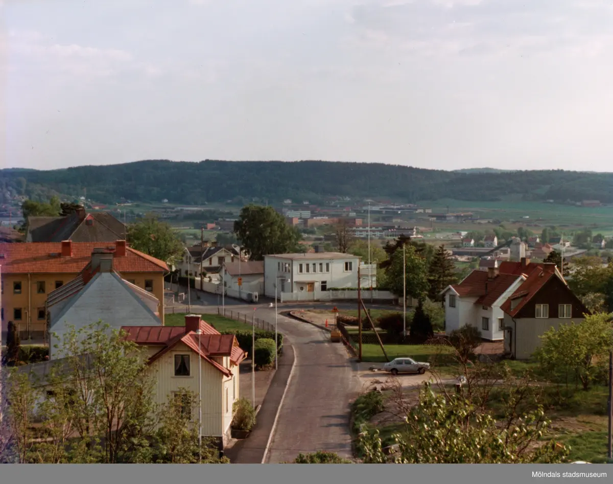 Utsikt från Lilla Glasberget mot bebyggelse vid Svanegatan i Ryet, Mölndal, omkring 1975-1980. Svanegatans korsning med Rygatan.