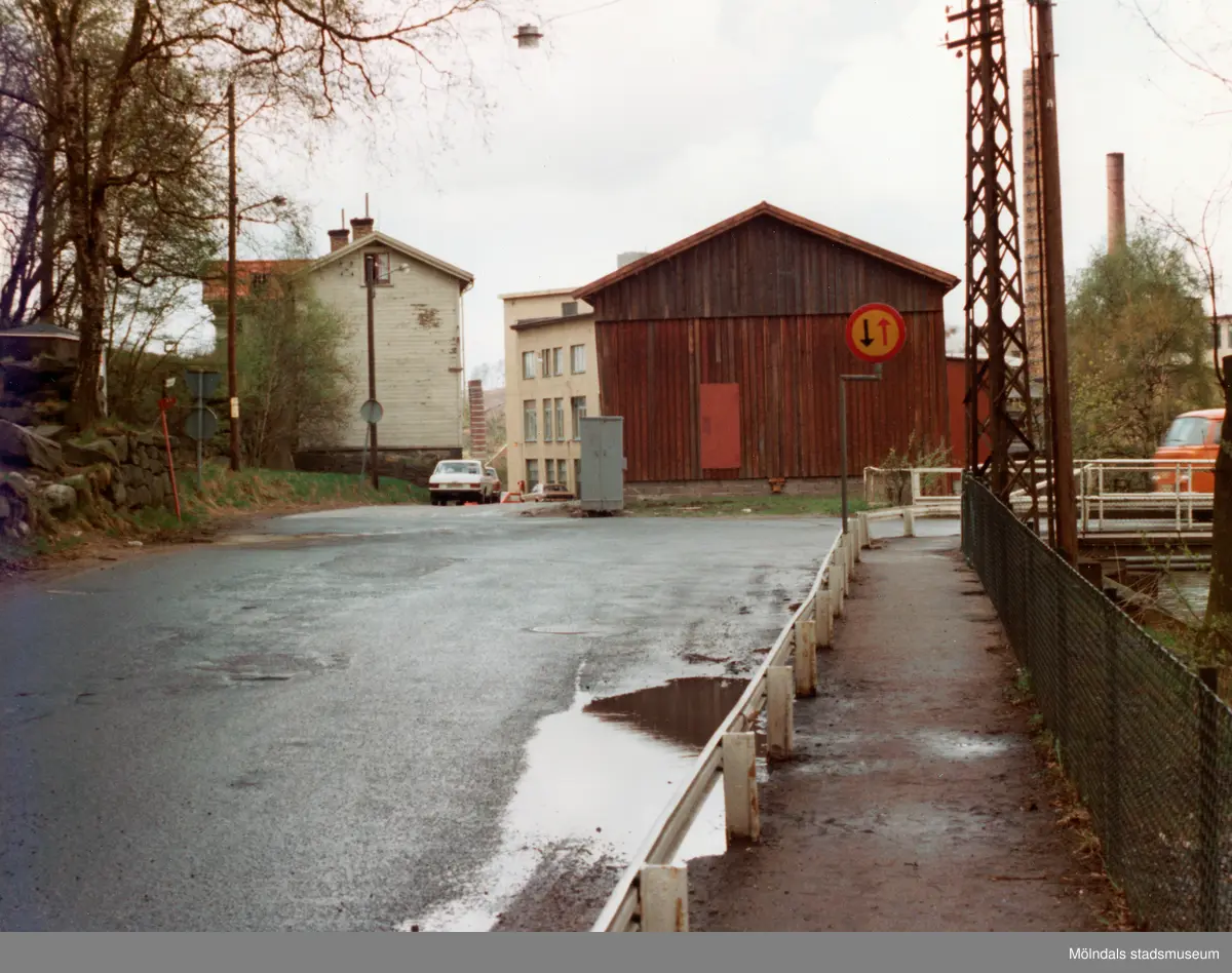 Mölndals Kvarnby omring 1975-1980. Vy från Pixbovägen mot byggnader vid Klippgatan. Till höger ses liten del av Rackarebron.