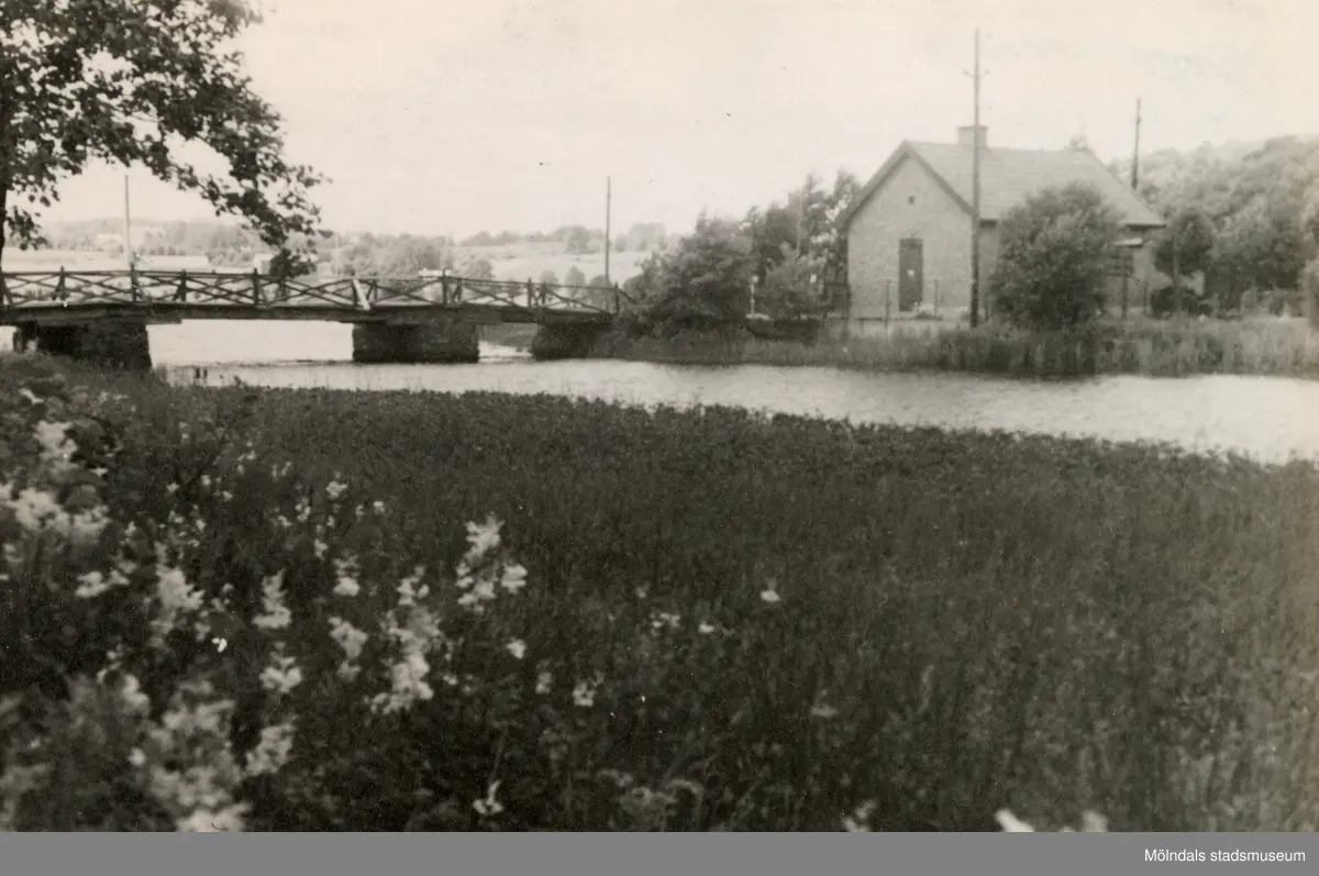 Gunnebo bro vid Stensjön i Mölndal, okänt årtal. Byggnaden till höger är pumpstationen.