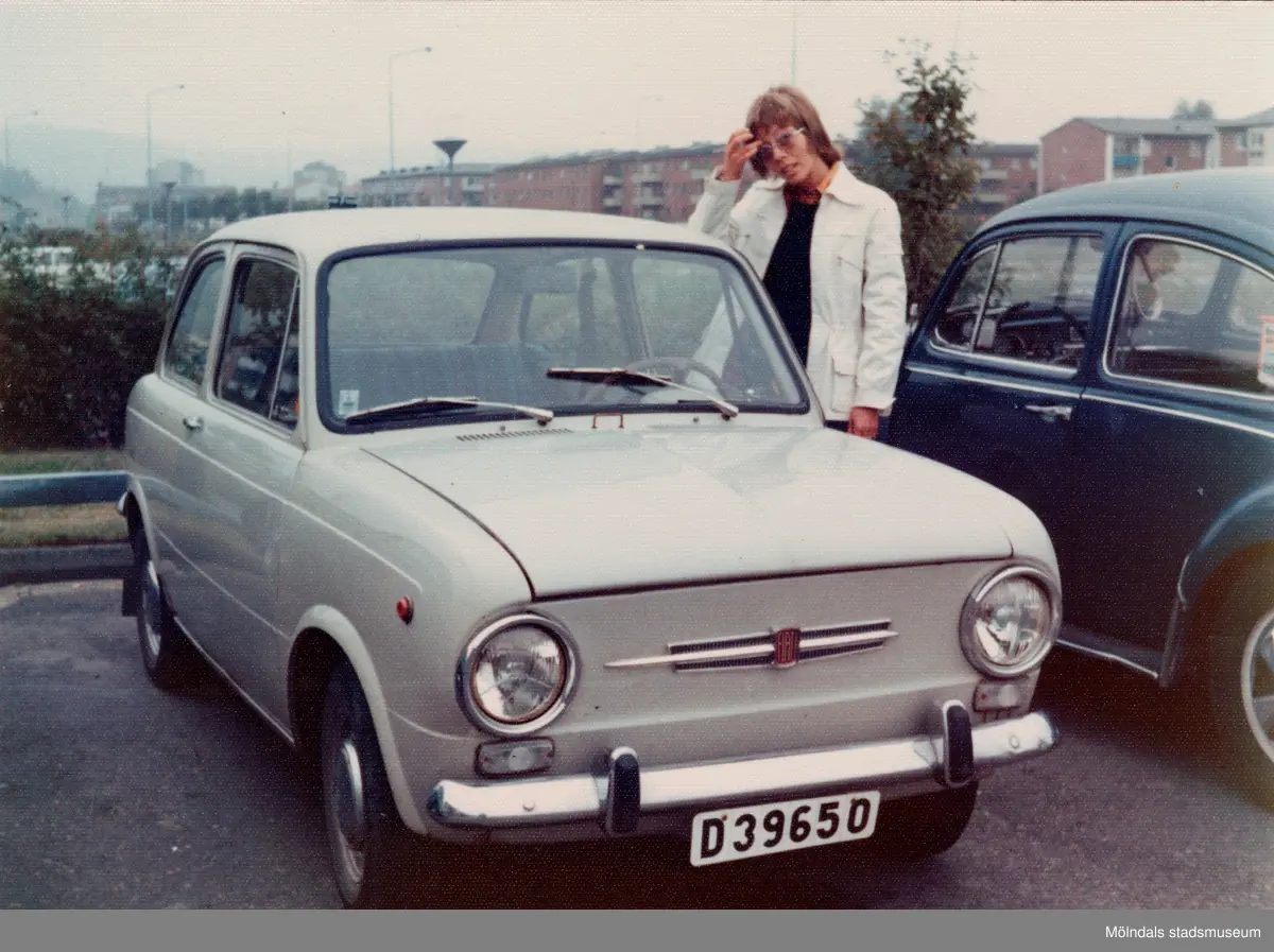 Karin Hansson (född Pettersson) står brevid sin Fiat 650 på parkeringen utanför bostaden på Havrekornsgatan i Bifrost, cirka 1972-1974.