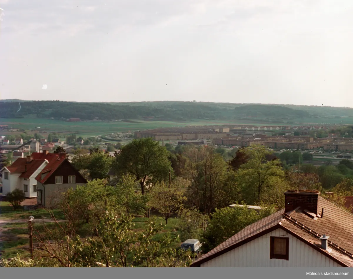 Utsikt från Lilla Glasberget mot bebyggelse i Åby, Mölndal, omkring 1975-1980. Närmast till vänster ses hus vid Svanegatan. Närmast till höger huset Roten K 32 vid Franckegatan.