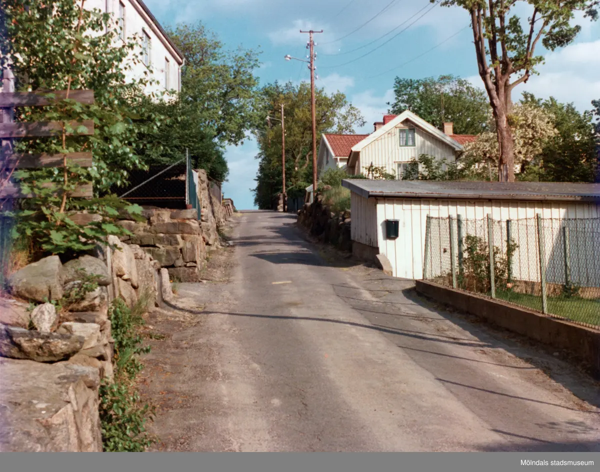 Åldermansgatan i Mölndals Kvarnby, omkring 1975-1980. På höger sida av gatan ses husen Roten K 15 och 14 samt uthuset till Roten K 13.