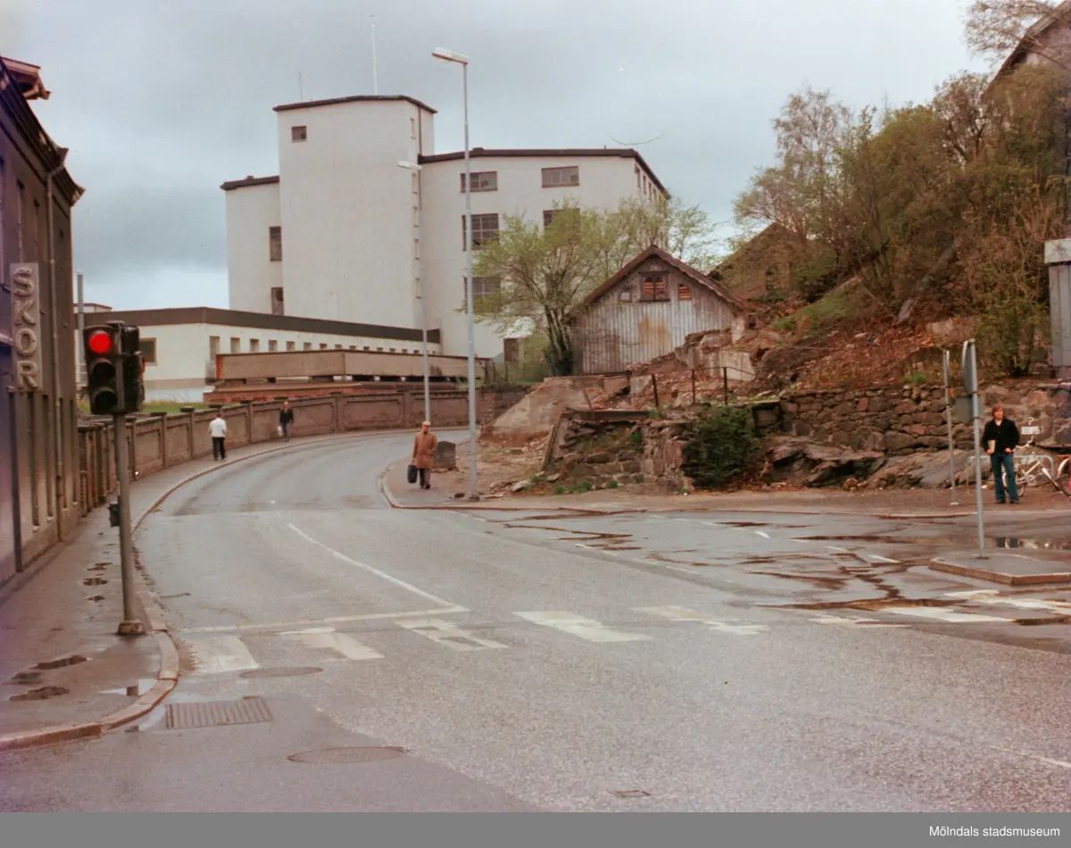 Kvarnbygatan i Mölndals Kvarnby, omkring 1975-1980. Vy från Gamla torget. Till vänster ses del av Kvarnbygatan 4. Rakt fram Papyrus byggnad 6.