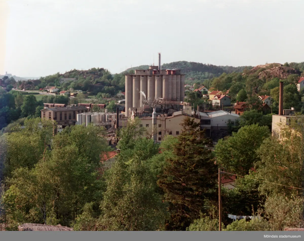 Utsikt från Lilla Glasberget mot industribyggnader tillhörande SOAB i Mölndals Kvarnby, omkring 1975-1980.