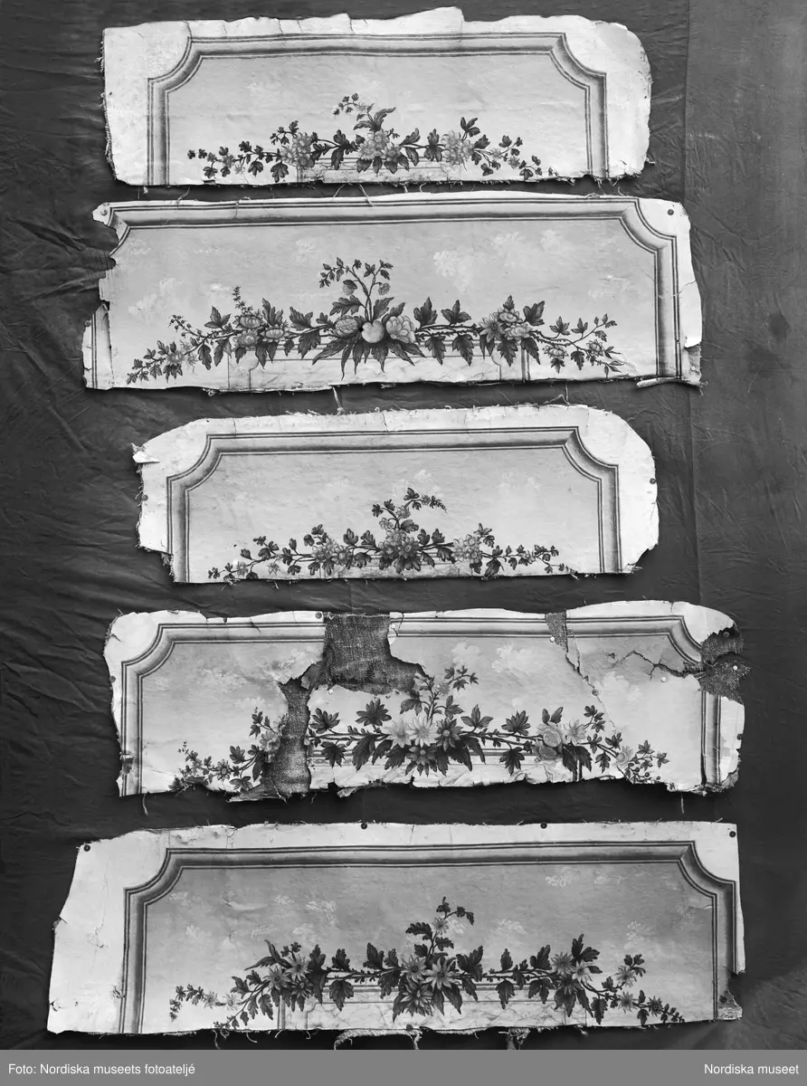 Dörröverstycken som ingår i en svit väggfält och delar av väggfält, 14 stycken, målade med limfärg på grovt papper och uppklistrade på grov, tät linneväv. Målade i en något naivistisk stil med fina detaljer. Samtliga delar med målad, profilerad ram i bronsimiterande ockratoner Från Freluga i Hälsingland. Målningarna är utförda av Jonas Hartman ca. 1775-1804. Dörröverstycken från 1799.