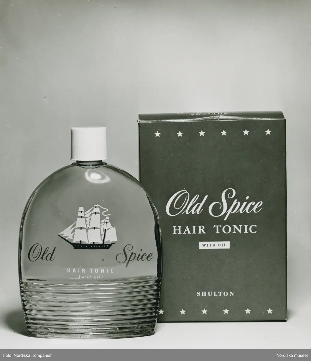 En flaska Old Spice hårvatten tillsammans med förpackning. Nordiska Kompaniet.